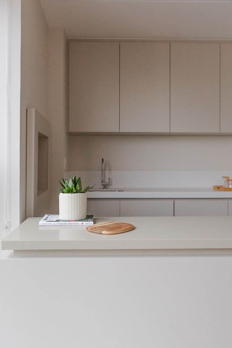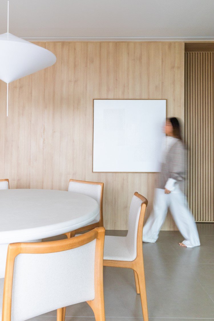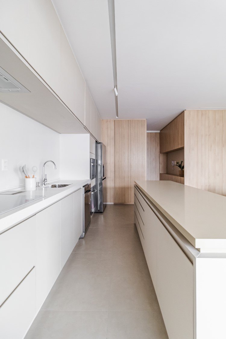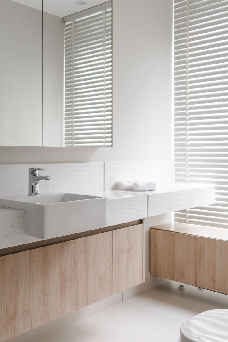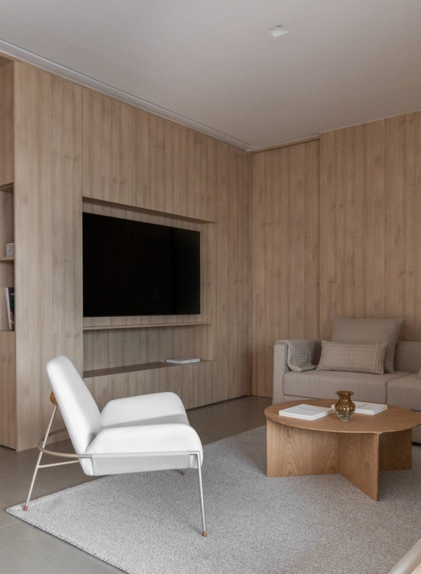 Apartamento neutro, suave e agradável. Os acabamentos principais escolhidos foram madeira carvalho e quartzo branco. Uma atmosfera leve e objetiva para um casal oriental e minimalista.