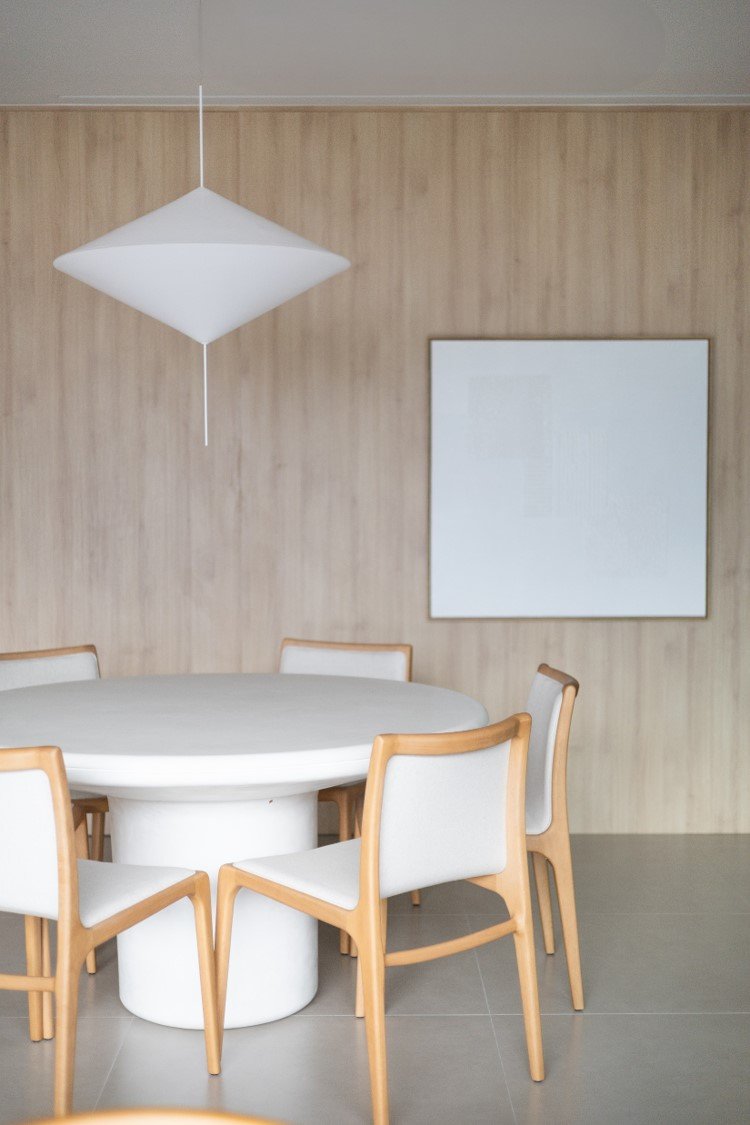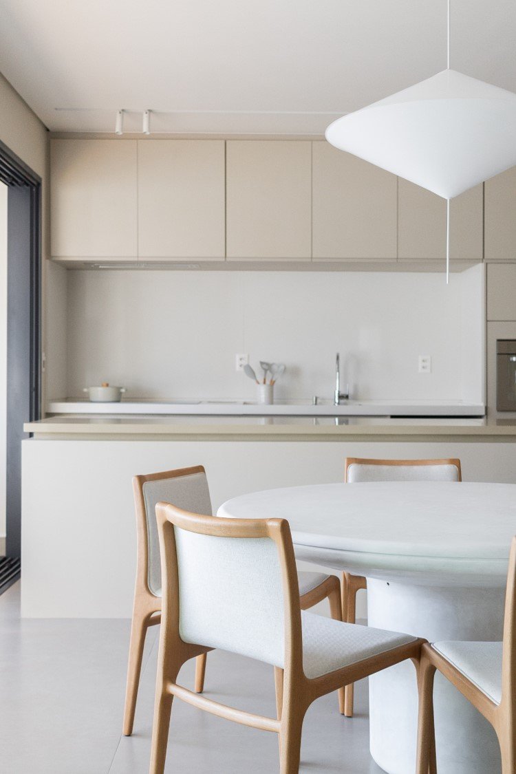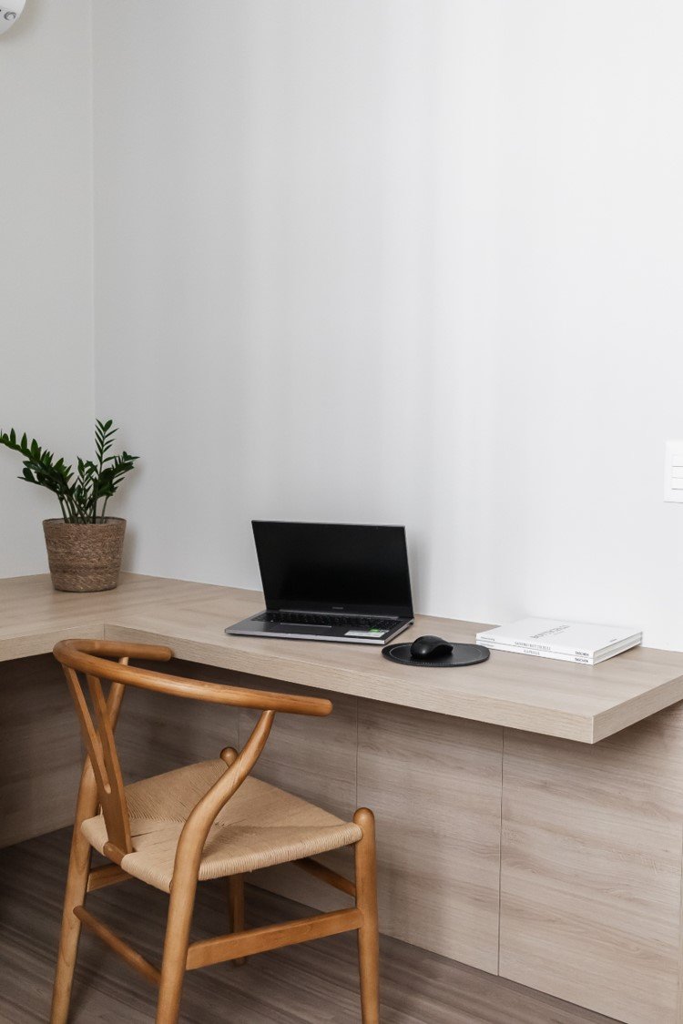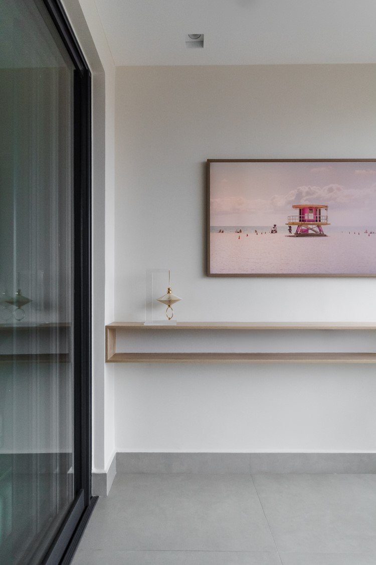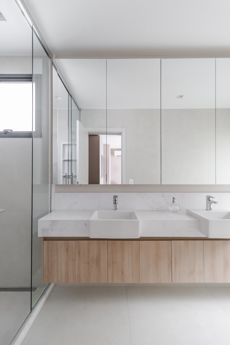 Apartamento neutro, suave e agradável. Os acabamentos principais escolhidos foram madeira carvalho e quartzo branco. Uma atmosfera leve e objetiva para um casal oriental e minimalista.