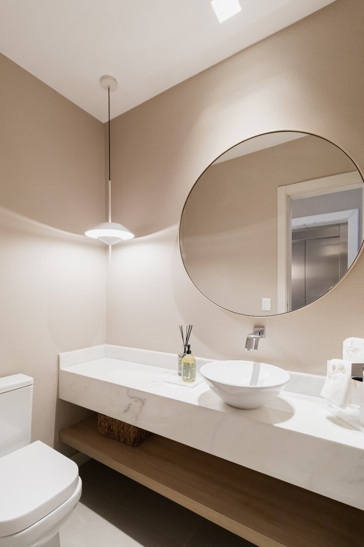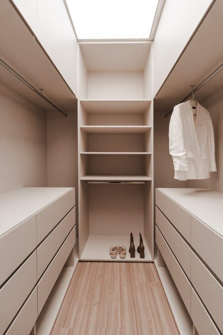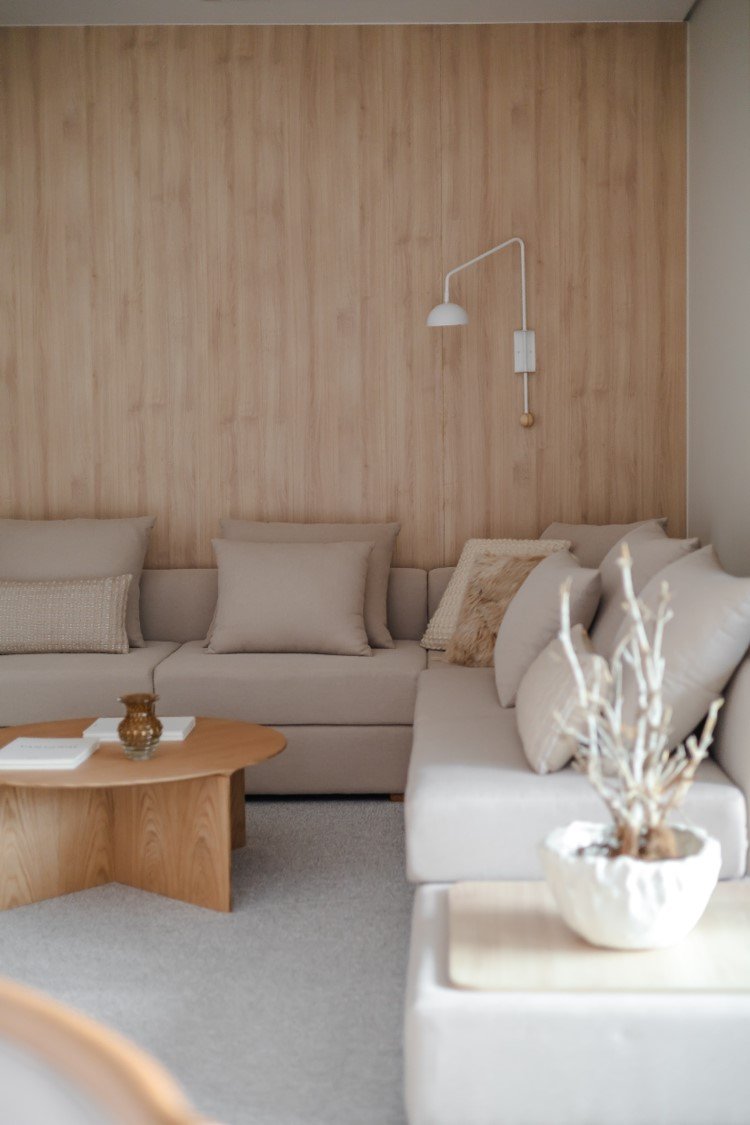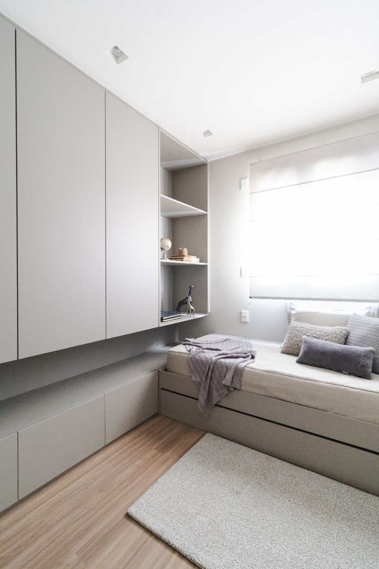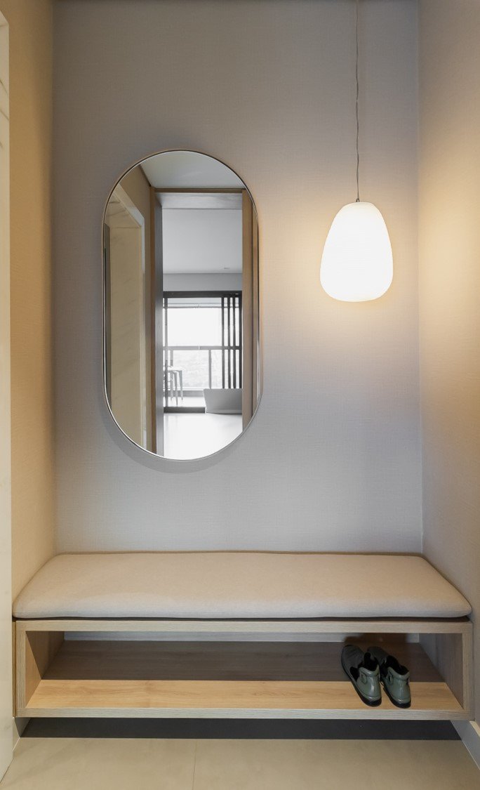Apartamento neutro, suave e agradável. Os acabamentos principais escolhidos foram madeira carvalho e quartzo branco. Uma atmosfera leve e objetiva para um casal oriental e minimalista.