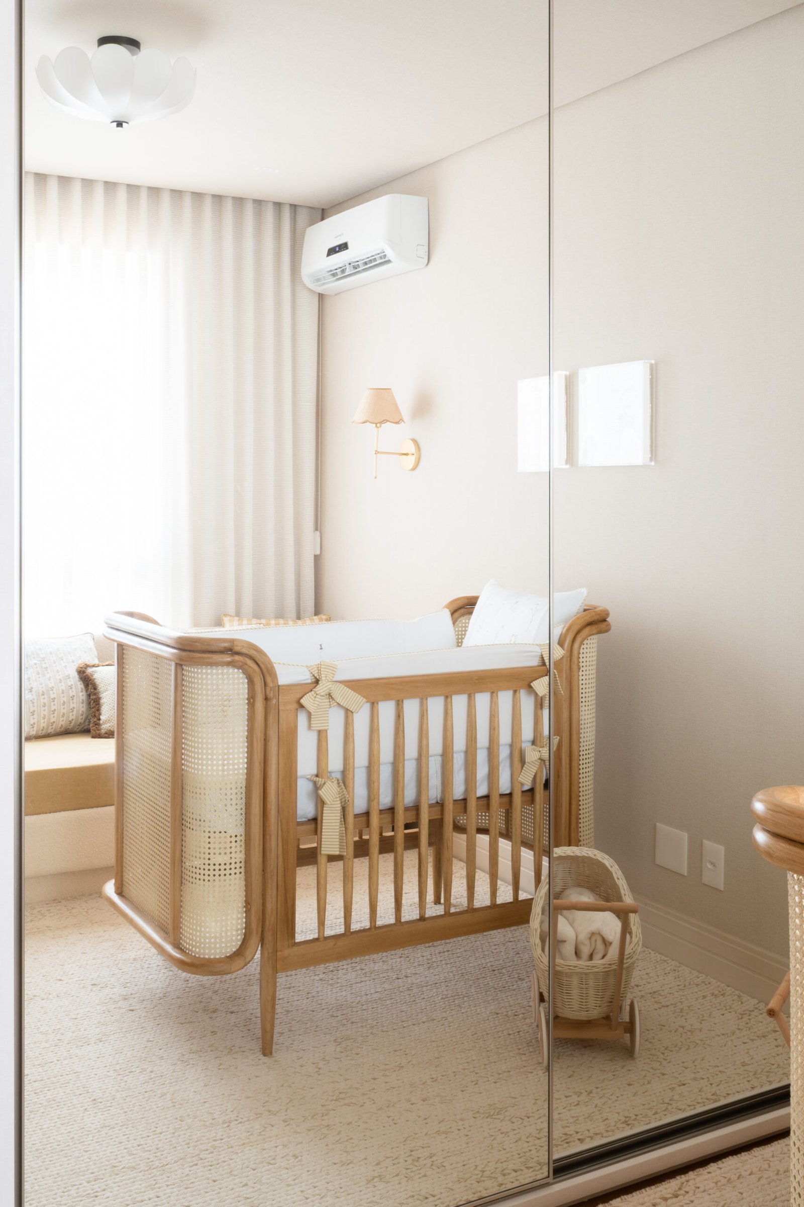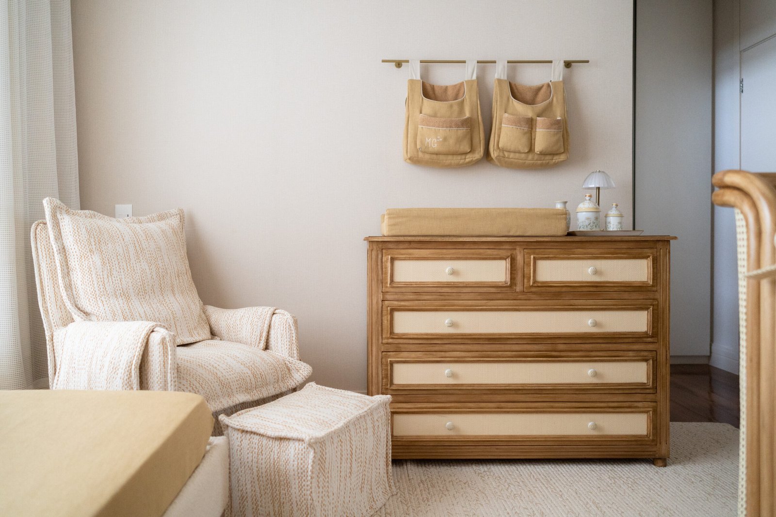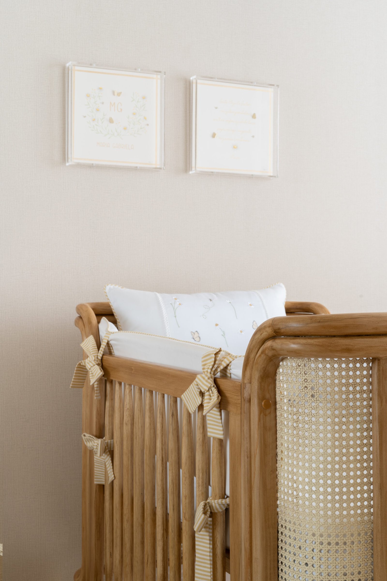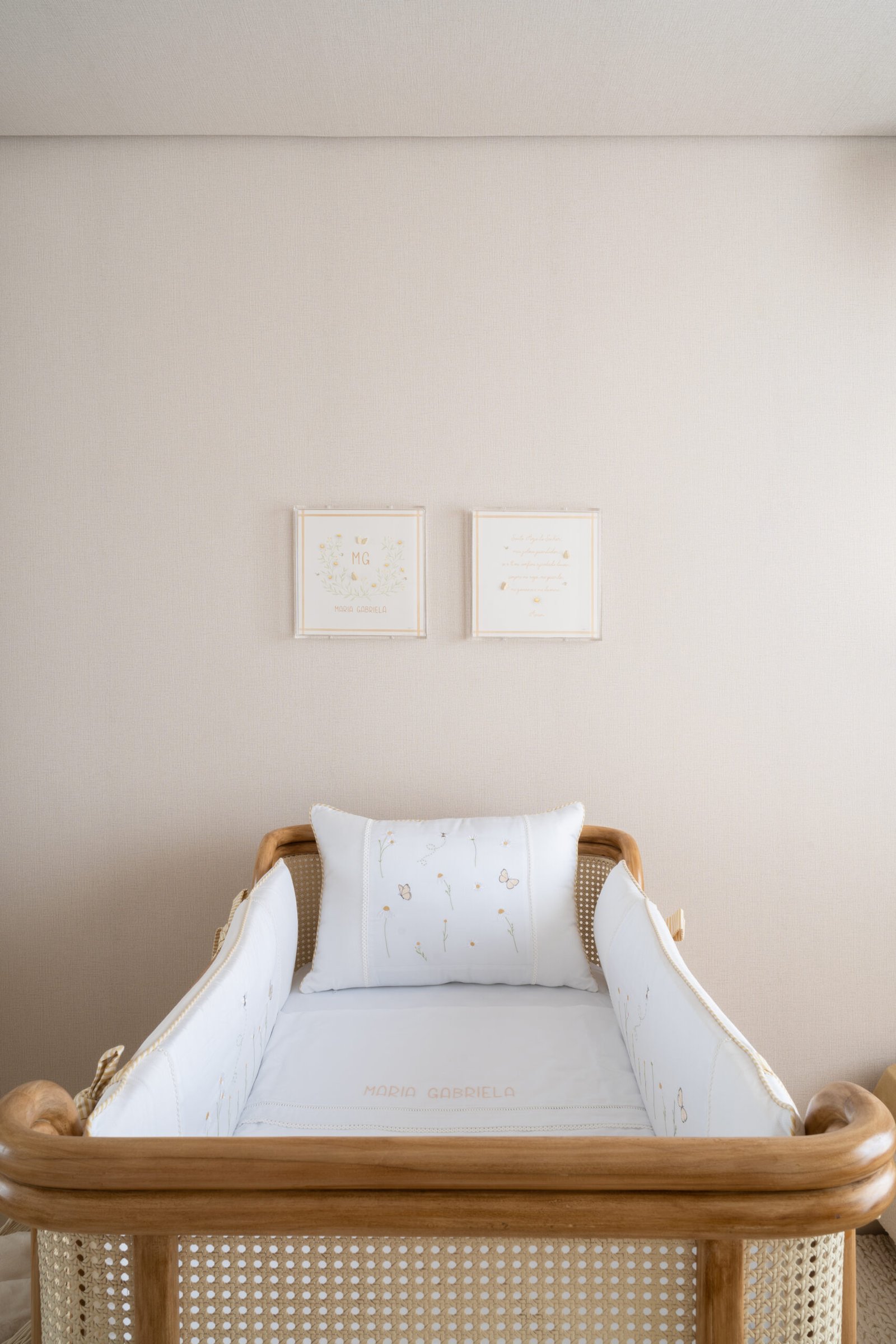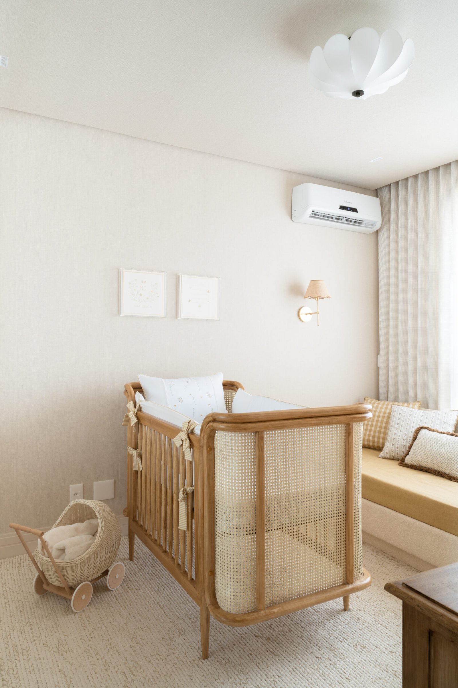 Quarto de bebê neutro e aconchegante. Marcado por diferentes texturas e detalhes em margarida. Mobiliário marcado por madeira e palha natural.