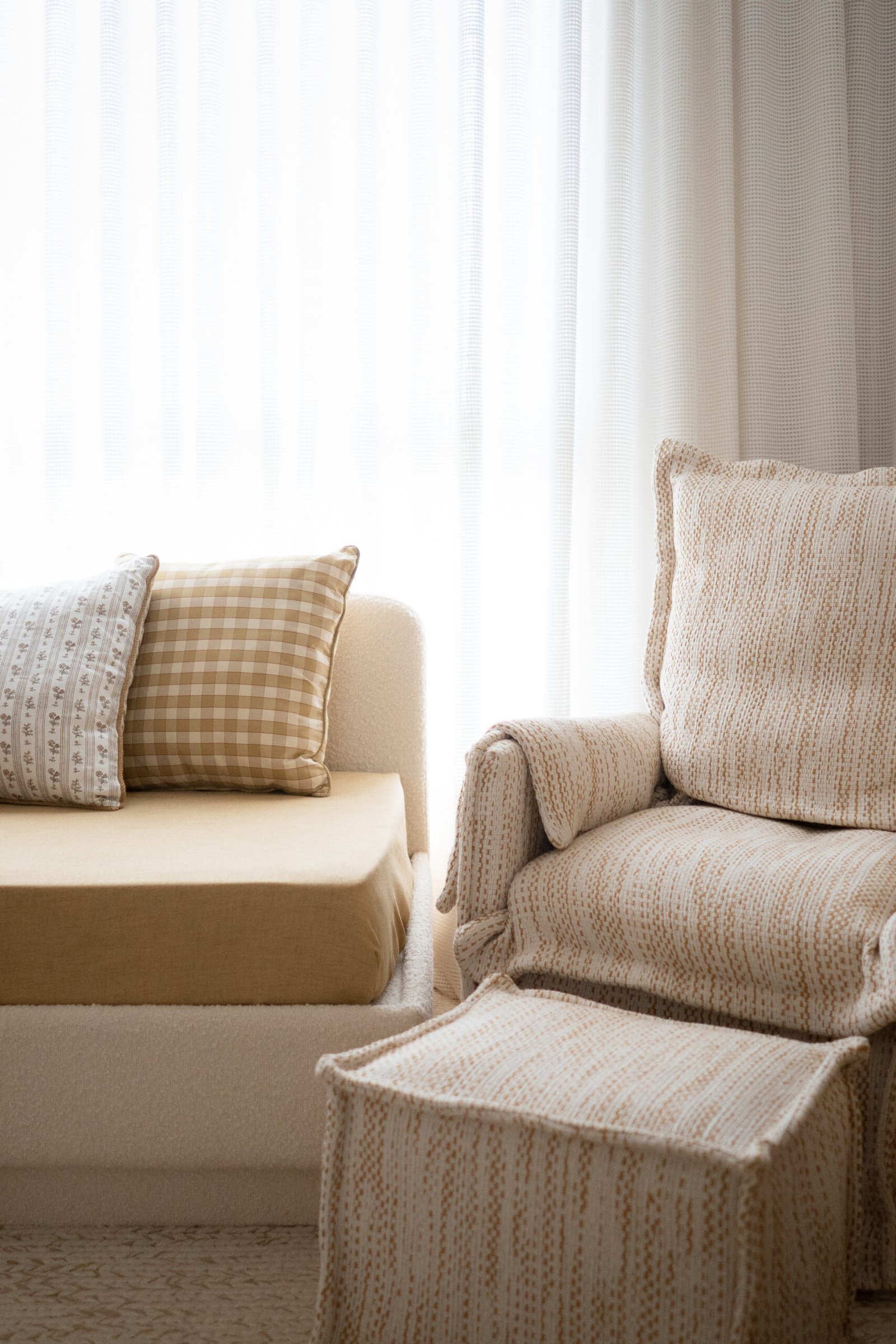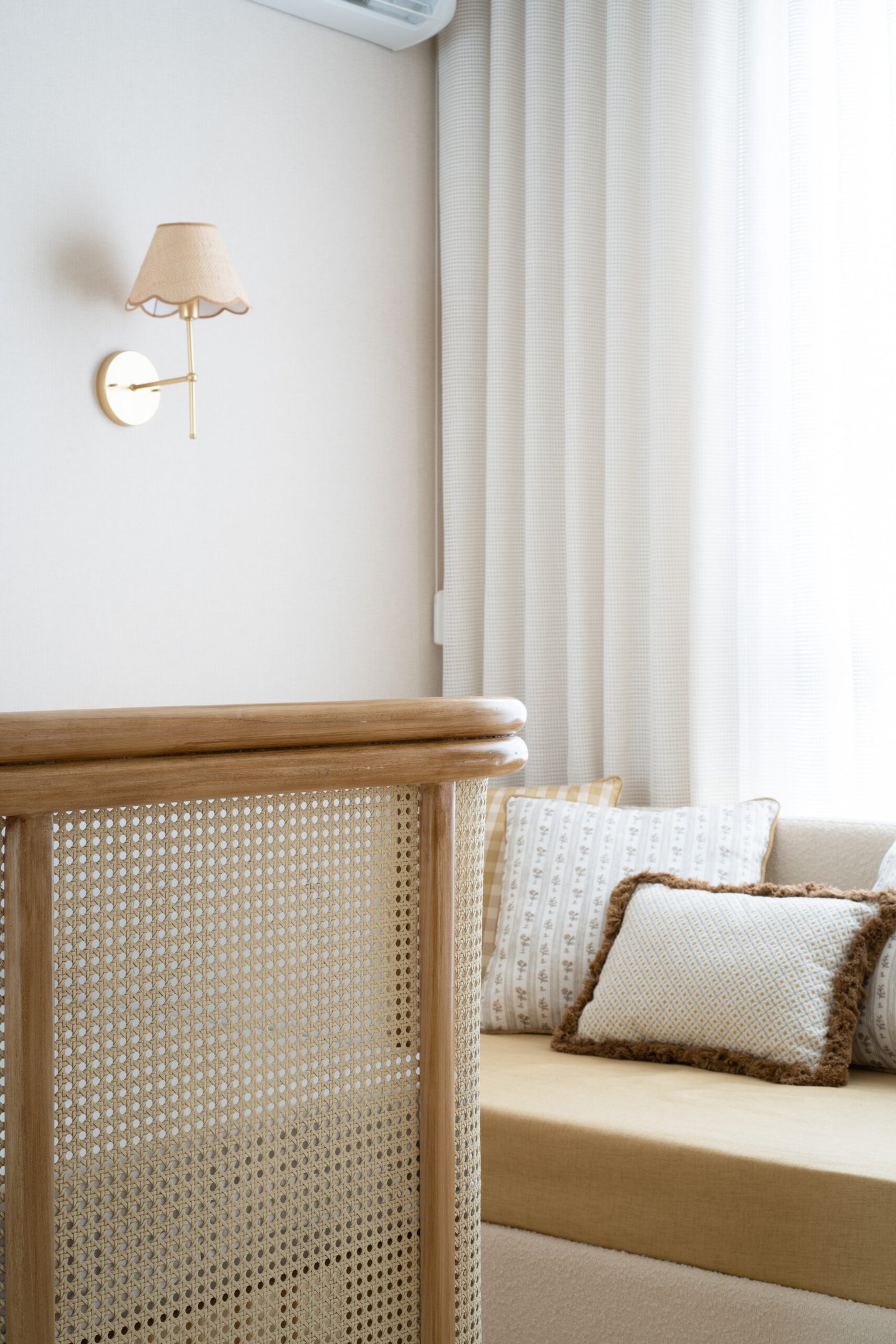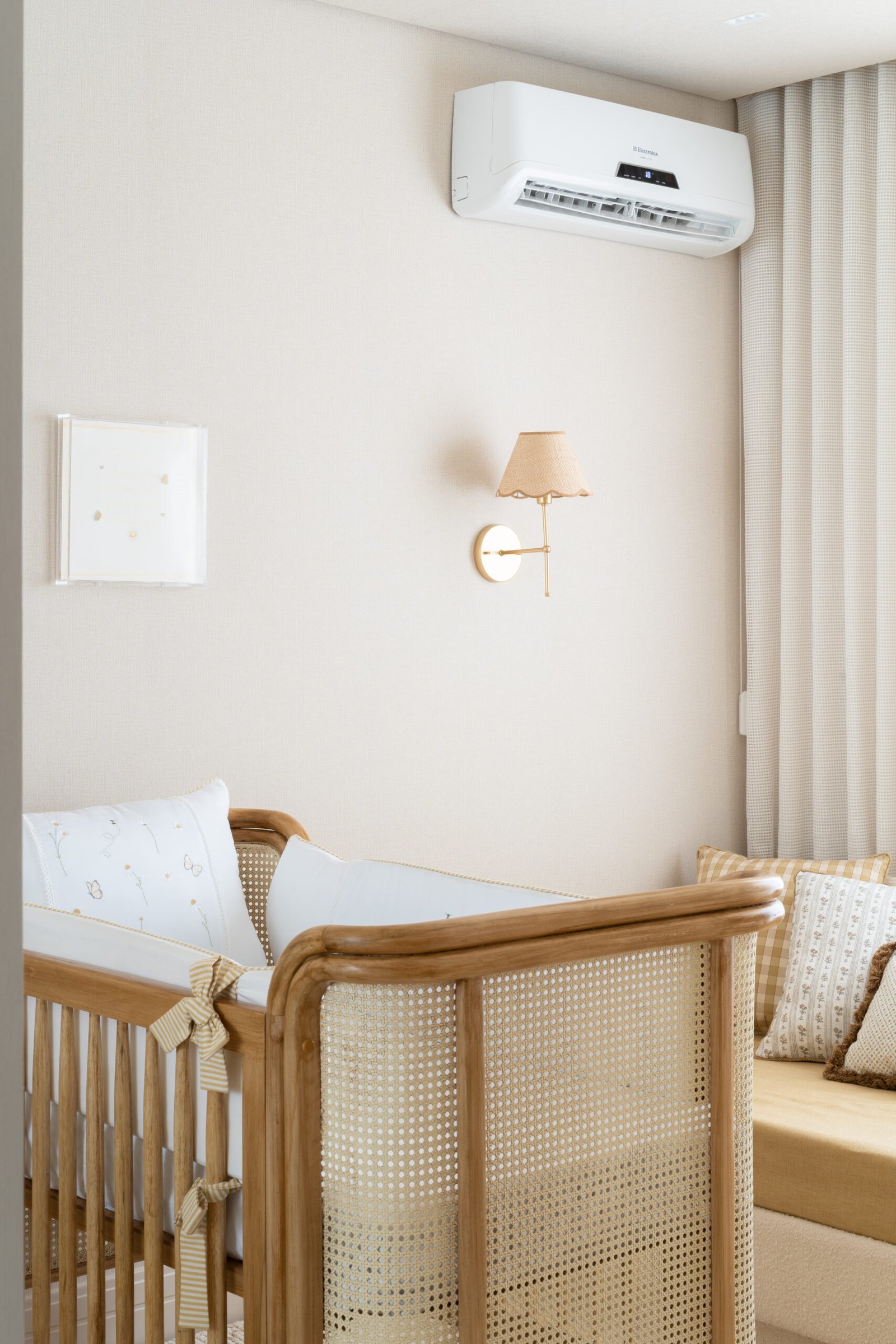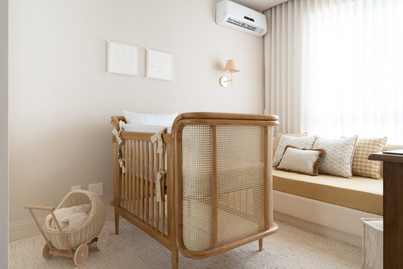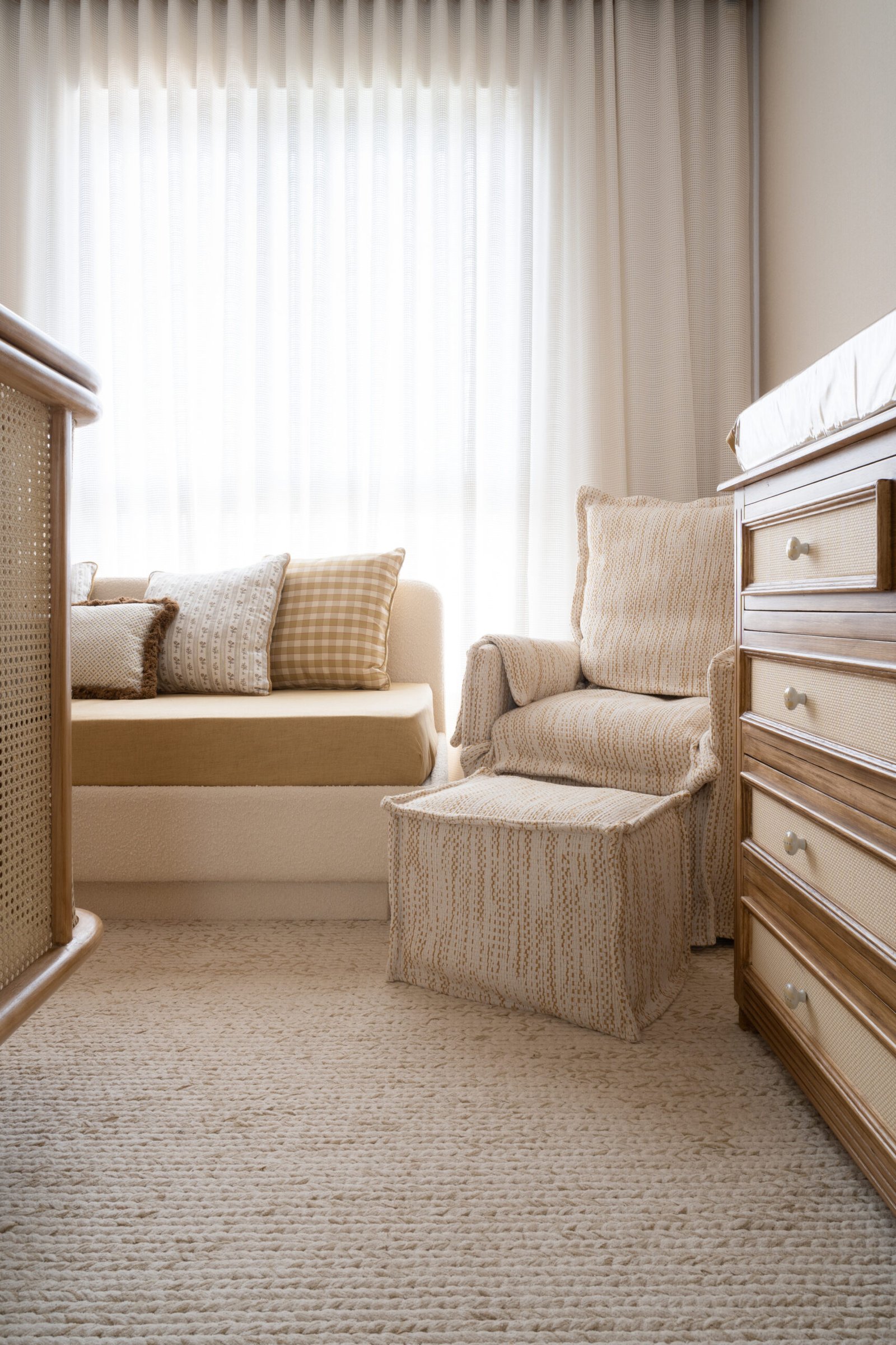 Quarto de bebê neutro e aconchegante. Marcado por diferentes texturas e detalhes em margarida. Mobiliário marcado por madeira e palha natural.